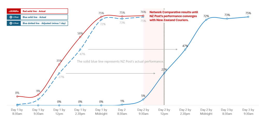 This visual shows the comparative delivery timings – the dotted line indicates what would have happened if NZ Post had not suffered a 24 hour network delay.